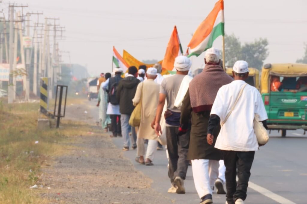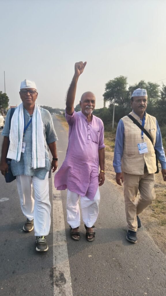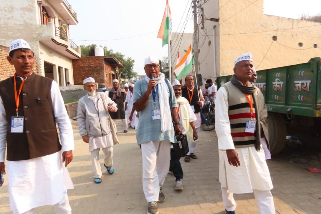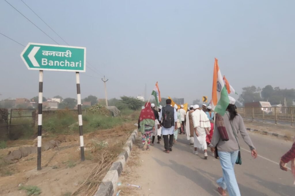 दोपहर में बंचारी गाँव की गलियाँ “किसानों की एकता ज़िंदाबाद” के नारों से गूँज उठीं, जब एक कदम गांधी के साथ पदयात्रा किसान नेता के.पी. सिंह के घर दोपहर के पड़ाव पर पहुँची। यहाँ जितेन नंदी ने कबीर गायन के माध्यम से समाज में एकता और मेल-जोल का संदेश दिया।