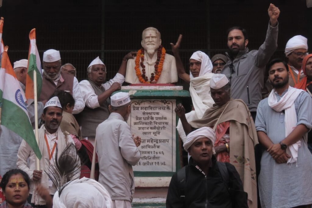 2 अक्टूबर को राजघाट, बनारस से संविधान, लोकतंत्र, सद्भावना और बंधुत्व का संदेश लेकर आरम्भ हुई ‘एक कदम गांधी के साथ’ पदयात्रा अपने 49वें दिन अग्रवाल धर्मशाला से आगे बढ़कर भारत के पहले पॉलिटेक्निक कॉलेज प्रेम महाविद्यालय पहुँची। इसकी स्थापना राजा महेंद्र प्रताप सिंह ने करवाई थी, जो सक्रिय स्वतंत्रता सेनानी और समाजसेवी थे। अपने वैश्विक कार्यों के लिए उन्हें 1932 में नोबेल पुरस्कार के लिए नामांकित किया गया था। दक्षिण अफ्रीका से भारत लौटने के बाद महात्मा गांधी महाविद्यालयों के दौरे पर थे और 19 अप्रैल 1915 को वे प्रेम महाविद्यालय, वृंदावन पहुँचे थे। सर्व सेवा संघ के राष्ट्रीय अध्यक्ष चंदनपाल और एक कदम गांधी के साथ पदयात्रा के संयोजक राम धीरज ने राजा महेंद्र प्रताप सिंह की प्रतिमा पर सुत माल्यार्पण किया।