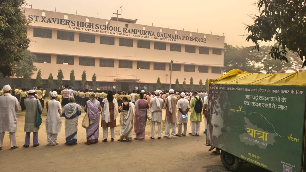 सुबह 8 बजे सेंट जेवियर्स हाई स्कूल, रामपुरवा (गौनाहा) में स्कूल असेंबली के दौरान यात्री दल का स्कूल प्रशासन द्वारा स्वागत किया गया। इस दौरान स्कूल के बच्चों ने ‘साबरमती के संत तूने कर दिया कमाल’ गीत प्रस्तुत किया। यात्रा दल की ओर से उमेश तूरी ने ‘जय जगत’ गीत गाया। इसके बाद यात्रा के संयोजक अशोक भारत ने यात्री दल के सदस्यों का परिचय कराया।